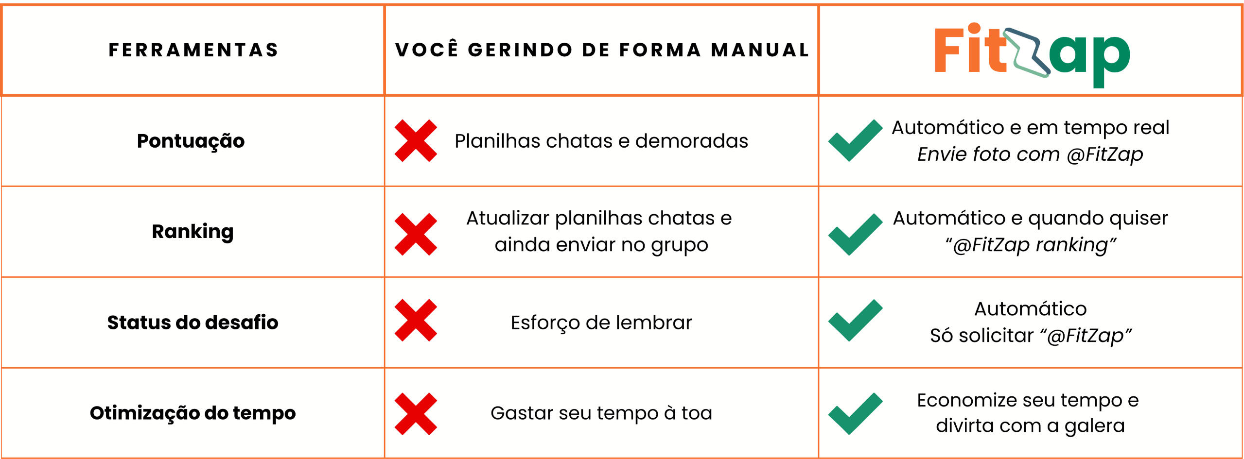 ✅ Crie desafios em segundos: Basta adicionar o @Fitzap no grupo e definir as regras da competição.📸 Compartilhe conquistas: Envie fotos dos seus treinos e contabilizamos os pontos para você.🏋️ Acompanhe o progresso do grupo: Ranking automático e relatórios semanais.😂 Motivação divertida: dispute o 1º lugar enquanto interage entre amigos.